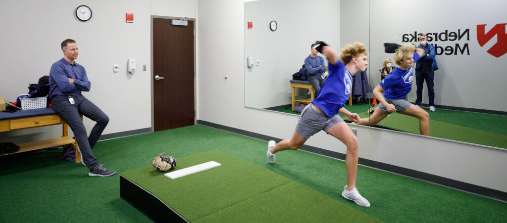 Dr. Fehringer consults with pitchers and their parents in a motion lab on the UNMC-Nebraska Medicine Omaha campus.