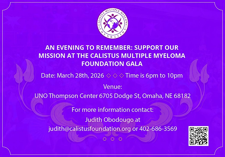 Saturday, March 28 | 6:00-10:00 PM Thompson Alumni Center, 6705 Dodge St, Omaha, NE 68182 Join the Fred & Pamela Buffett Cancer Center and the Calistus Multiple Myeloma Foundation for an unforgettable evening of hope, support, and impact at the CMMF Gala—championing multiple myeloma patients! More information and registration: https://www.eventbrite.com/e/an-evening-to-remember-support-our-mission-at-the-multiple-myeloma-gala-tickets-1265632182929?