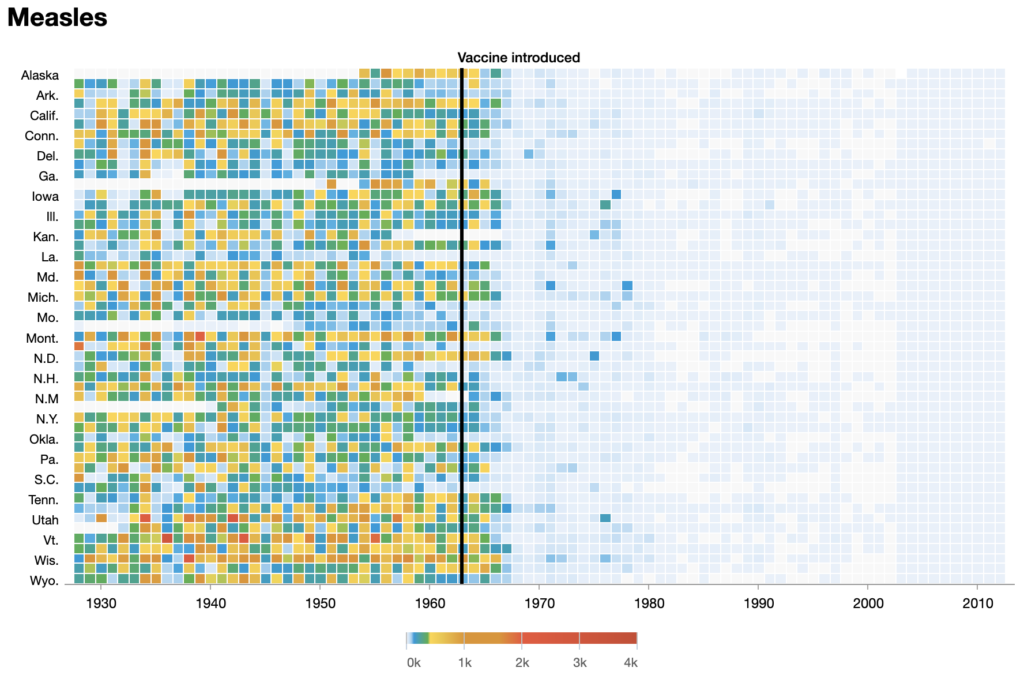 WSJ The number of infected people, measured over 70-some years and across all 50 states and the District of Columbia, generally declined after vaccines were introduced.