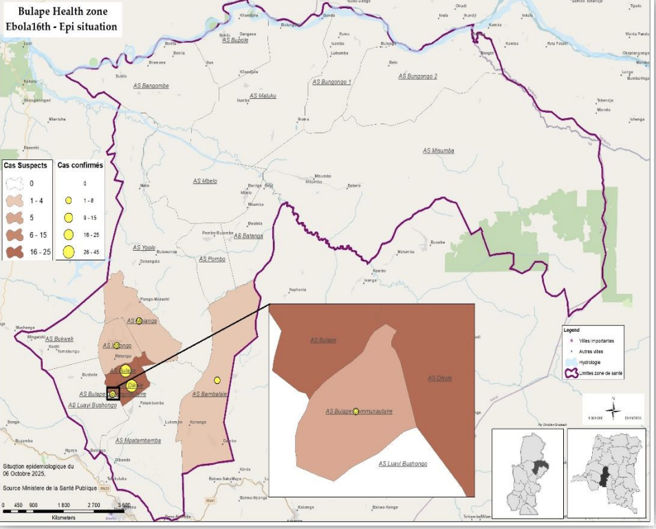 The 16th outbreak of Ebola Virus Disease (EVD) in the Democratic Republic of Congo (DRC) has occurred in the province of Kasai. It was declared on September 4, 2025, by the Minister of Public Health, Hygiene and Prevention. As of October 6th, the Ebola Virus Disease (EVD) outbreak in the Democratic Republic of the Congo has reached 64 total cases (53 confirmed, 11 probable), including 43 deaths, resulting in a case fatality rate of 67,2 percent. The outbreak remains confined to