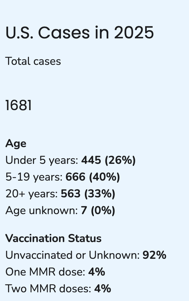 American Hospital Assn here have been 1,681 confirmed cases of measles in the U.S. so far this year, according to the latest Centers for Disease Control and Prevention data. Cases have been reported by 42 states and jurisdictions, and 12% of cases have been hospitalized. There have been 44 reported outbreaks, and 87% of all cases are outbreak-associated. The vaccination status of 92% of all confirmed cases is classified as “unvaccinated or unknown.” Link to CDC Data