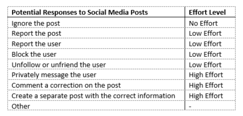 They could select one or more of the actions described in the table below. They were also asked whether and how the poster of the post and the platform on which it was posted would influence their response. The goal wasn’t to make these already highly skilled analysts better fact-checkers, but to see whether the training could make them more willing to intervene.