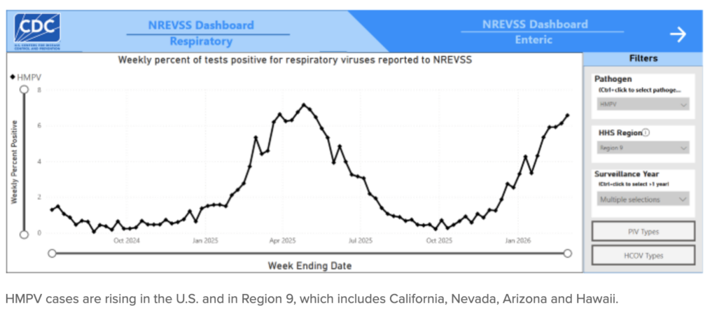 HMPV is seasonal — like the annual flu — and it is currently spiking in the U.S., according to the National Respiratory and Enteric Virus Surveillance System (NREVSS), which monitors viral activity.