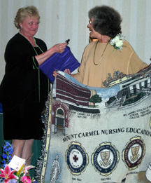Barb Piper, Ph.D., presents Ada Lindsey, Ph.D., with a retirement gift from one of Dr. Lindsey’s first employers, Mt. Carmel School of Nursing in Columbus, Ohio, where she served as assistant director. |