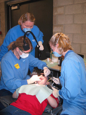 Dental hygiene students, Andrea Ohlrich and Kristin Taake, put sealants on the teeth of Breeze Tarkintion, as Gwen Hlava observes. Hlava is chairperson and associate professor of the UNMC College of Dentistry’s dental hygiene program.