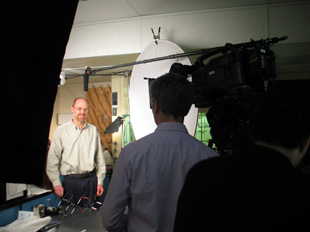 Jonathan Vennerstrom, Ph.D., associate professor of pharmaceutical sciences, UNMC College of Pharmacy, gets ready to be interviewed by William Hicklin of the British Broadcasting Corporation (BBC). |