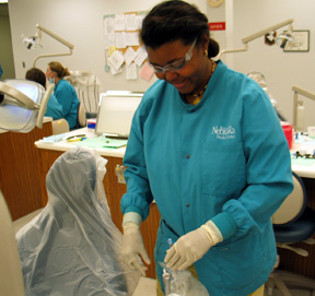 Fourth-year dental hygiene student Marie Goss prepares for her next client in the south clinic. |