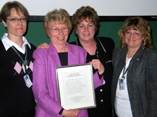 Mary Haven received a framed copy of her testimonial poem from Fran Higgins, left, Susan Miyeno, second right, administrator I, and Sue Prusia, accounting technician, SAHP health services administration division. |