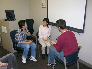 Medical student Eric Schneider (right) listens as Xingqi Wang (left) translates for Jianhong Sun. The UNMC employees, who speak Chinese, volunteered to help students learn how to effectively use interpreters in medical settings. |