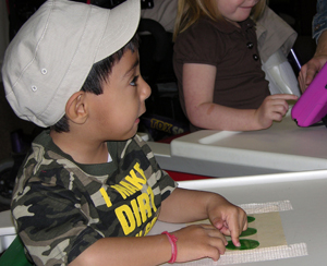 Ajay, 3, uses three green dots drawn on a piece of paper to remind him to speak in full sentences instead of single words. Born with femoral facial syndrome, Ajay has attended the Scottish Rite Masons “Rite Care” clinics at the Munroe-Meyer Institute for almost two years. |