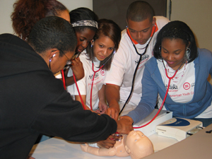 Students listen for the difference between normal and irregular breathing in an infant. The hands-on experience with patient simulators provided health information and reinforced their desire to pursue health careers. |