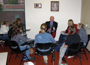 Jim Temme, associate director of SAHP radiation science technology education, discusses his program’s admission requirements and other topics with undergraduate students at the University of Nebraska at Kearney. |
