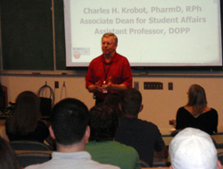 Charles Krobot, Pharm. D., address incoming pharmacy students at last month’s “Welcome to Our World” event, which let the new students hear from current students, teachers and administrators in an effort to get acquainted with the college.