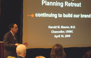 UNMC Chancellor Harold M. Maurer, M.D., speaks at April’s strategic planning retreat. The plan that was formulated at the retreat has been posted on the UNMC Intranet. |
