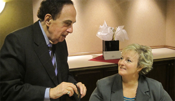 Valerie Gunderson with UNMC Chancellor Harold M. Maurer, M.D., at a breakfast to recognize Gunderson for receiving the Chancellor’s Gold ‘U’ award. |