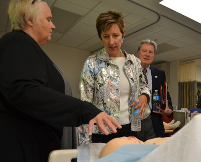 Legislative candidate Patty Pansing Brooks, center, speaks with Patti Carstens, program manager in the clinical skills center, and Bob Bartee, UNMC vice chancellor for external affairs, during a tour of UNMC’s clinical simulation lab Monday. |