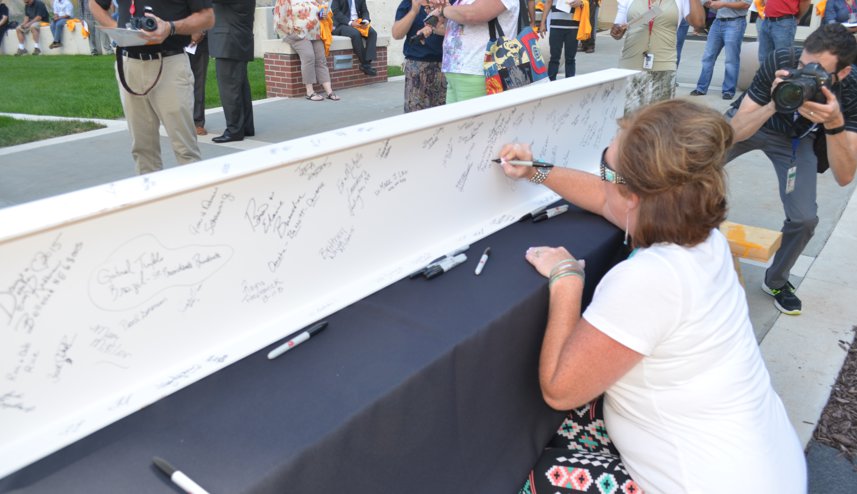 Nebraska Medicine staff and UNMC faculty, staff and students, came out – along with donors, campus and community leaders and other supporters – to sign the beams and see them raised.