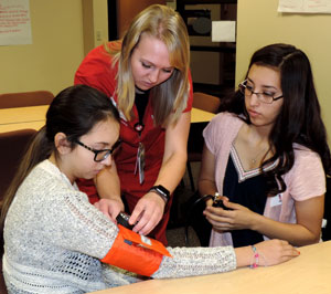 UNMC West Nebraska Division nursing student Jessica Bruce, center, shows high school students how to take a blood pressure. |