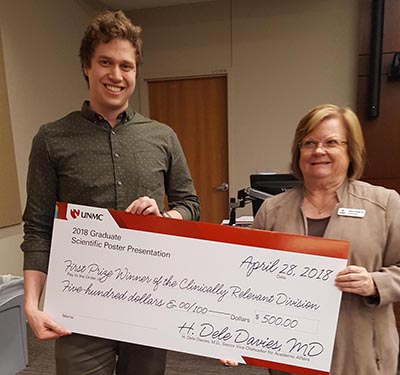 Prizes were awarded to graduate students in the categories of clinically relevant and non-clinically relevant research. The top prize in each category was $500 and a $1,500 travel award, donated by Bio Nebraska.