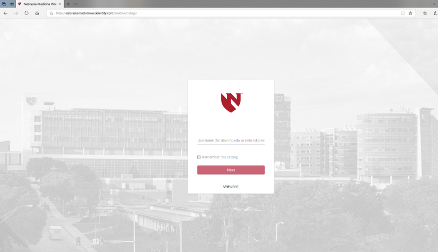 The current login page looks like this, both on and off the network. It will continue to look like this on UNMC and Nebraska Medicine network. You may use either your full email address or network ID and password.