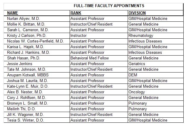 Congratulations to the following faculty members on their promotions. Congratulations to the following for their Department of Internal Medicine faculty appointments. Share twitter facebook bluesky email print