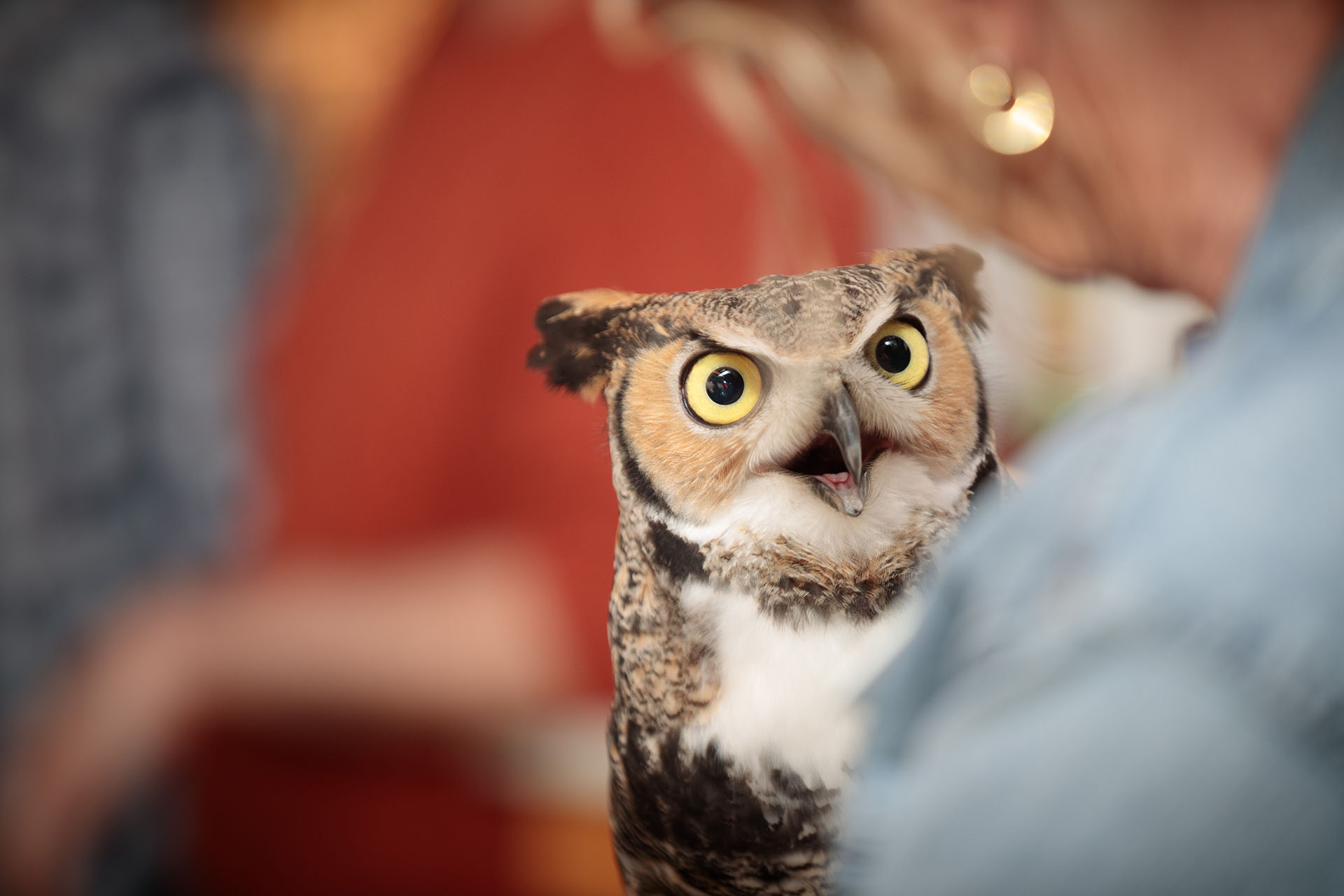 The professorial-looking owl, a great horned owl named Orion, did not actually give a lecture at the Nebraska Science Festival event.