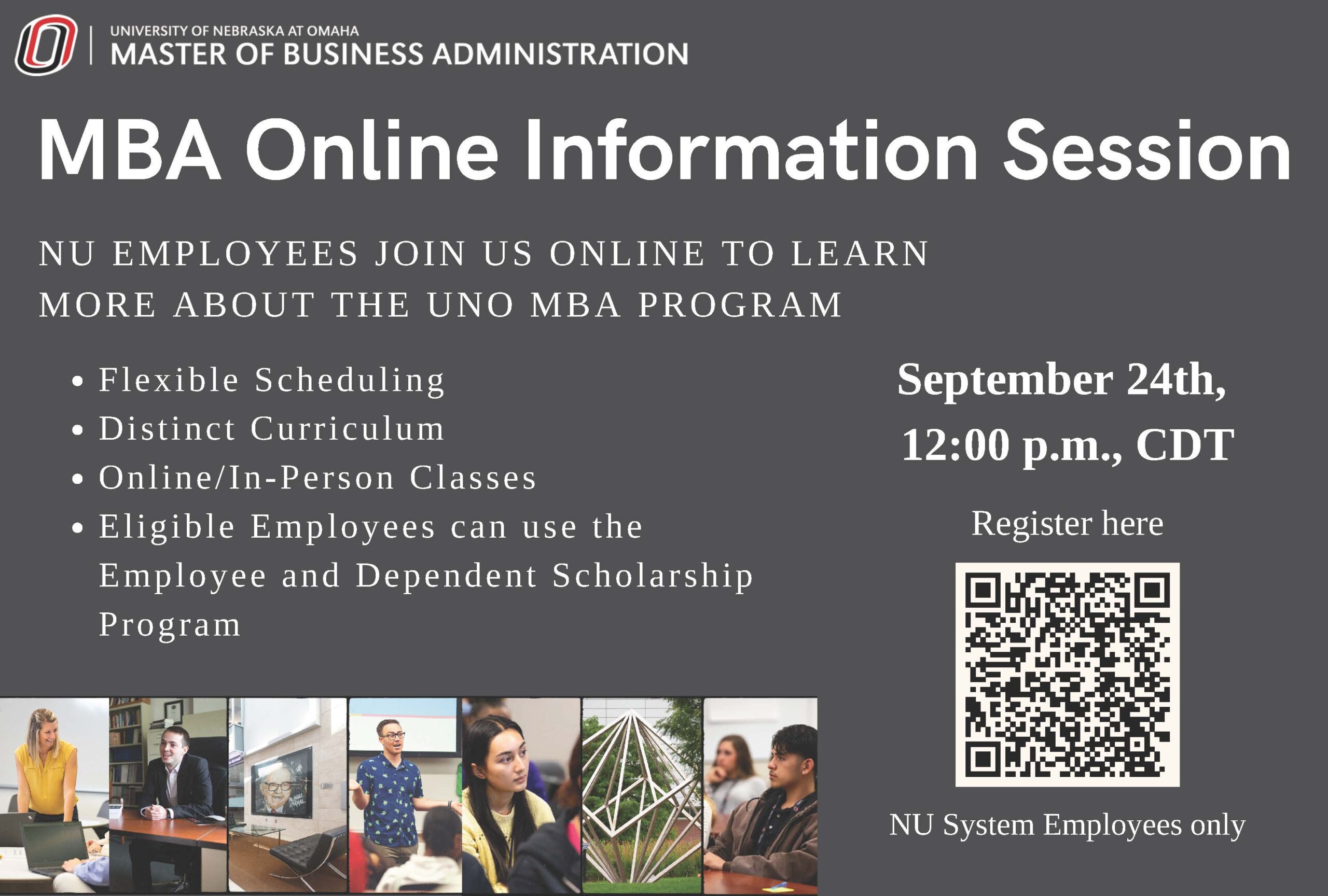 Program representatives will provide details on the flexible MBA structure, its ten concentration areas and how to take advantage of employee benefits for UNO courses.