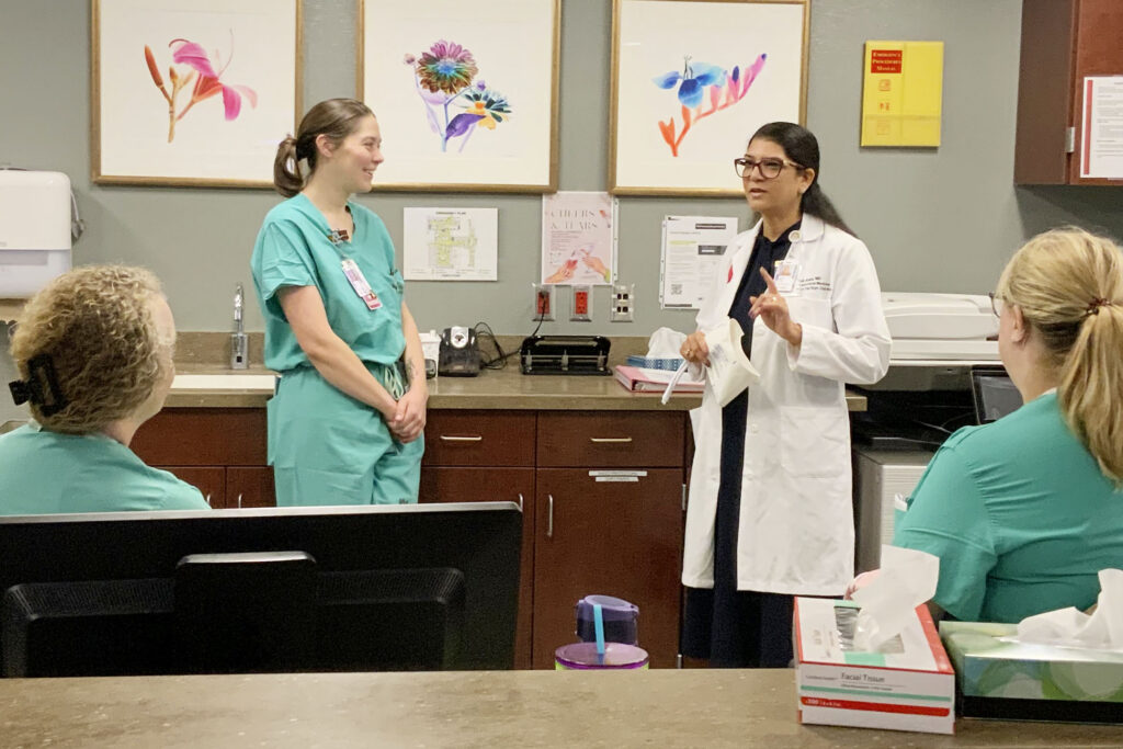 Sarosh Rana, MD, talks with Nadia Reiher (at left), MD, OB-GYN resident, and Shari Belter and Brandee Ritter, staff nurses in women’s and infant services.