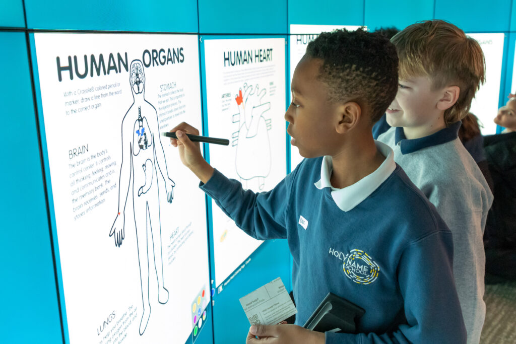 Fourth-grade students from Holy Name Elementary School entered the Davis Global Center on Jan. 13, the display rotating human organs, heart, lungs and more in the atrium’s three-story screen prompted a chorus of “ooohs” and “aaahs” from the youngsters.