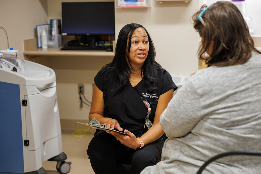 Dr. Candace Giles talks to a simulated patient in a procedure room in the Olson Center for Women's Health.