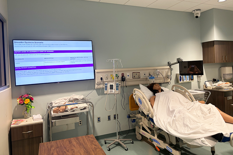 High-fidelity simulator set up for a shoulder dystocia simulation in the Davis Global Center.