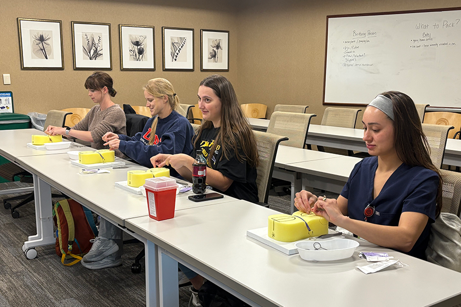 Fourth-year medical students practice their skills at repairing perineal lacerations with a sponge task trainer.