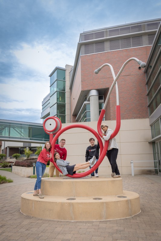 Five Scott Scholars pose on the stethoscope statue outside the Michael F. Sorrell Center for Health Science Education on the Omaha campus.
