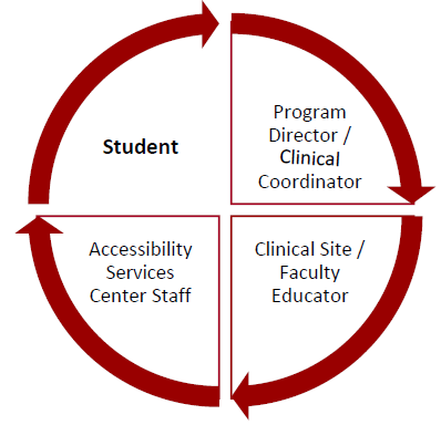 The clinical accommodations interactive process begins with the student and involves the program director/clinical coordinator, the clinical site/faculty educator, and the Accessibility Services Center.